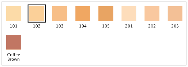 「いつも標準色で合う」「標準的な肌色をしていると思う」という方の色選びでは、標準色102を選ぶとスッと肌に馴染んでくれます。