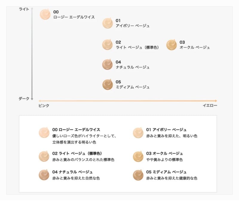 • 01:アイボリーベージュ…赤味と黄味を抑えた、明るい色。
