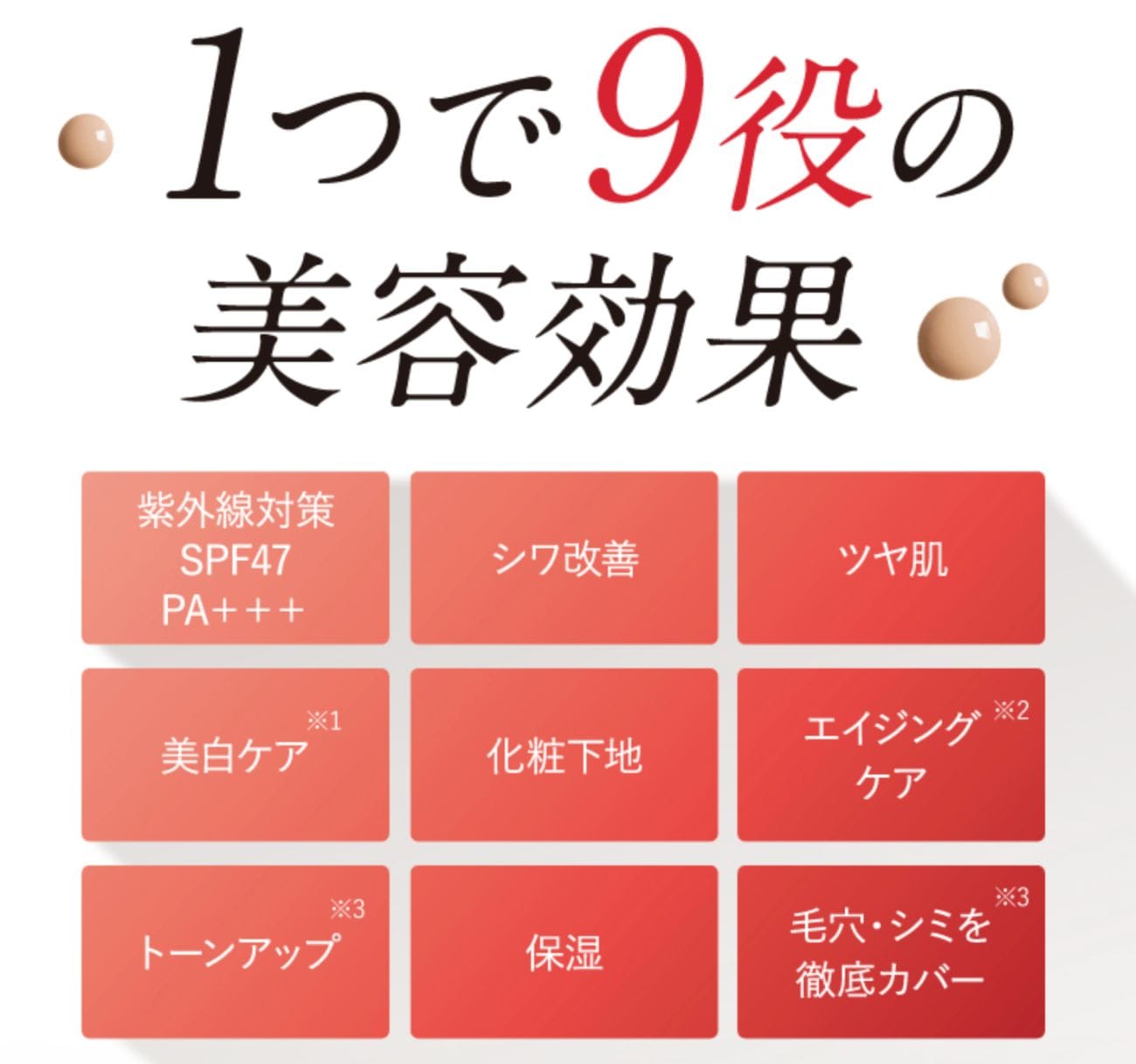 カバー力があり、保湿力もたっぷり、そして、美白ケアやエイジングケアといったスキンケア成分を豊富に含み、年齢肌の悩みを打ち砕きます。そして、厚生労働省が許可した効果・効能に有効な成分が、一定の濃度で配合されている医薬部外品なので、安心して使えるファンデなんです。