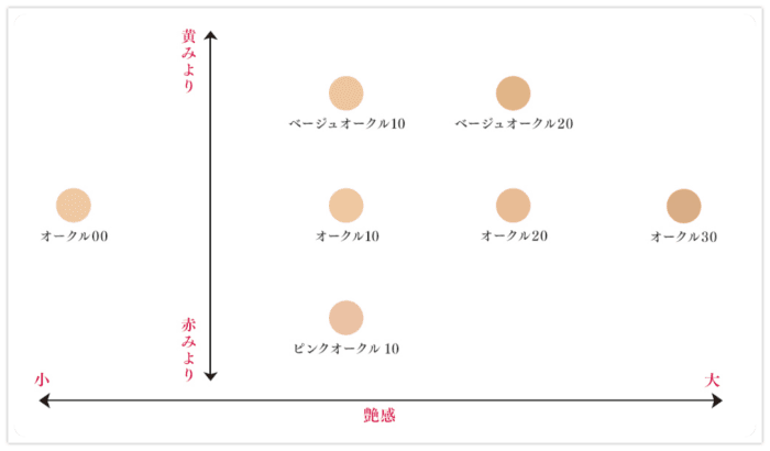 マキアージュは「明るめの肌はマット肌を好まれ、健康的な肌色はマット~ツヤのある質感を好まれている」という事実を元に、色展開でも肌色に合わせて質感が追求されています。